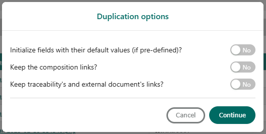 • Keep traceability and external document links: Duplicate traceability and external document links.