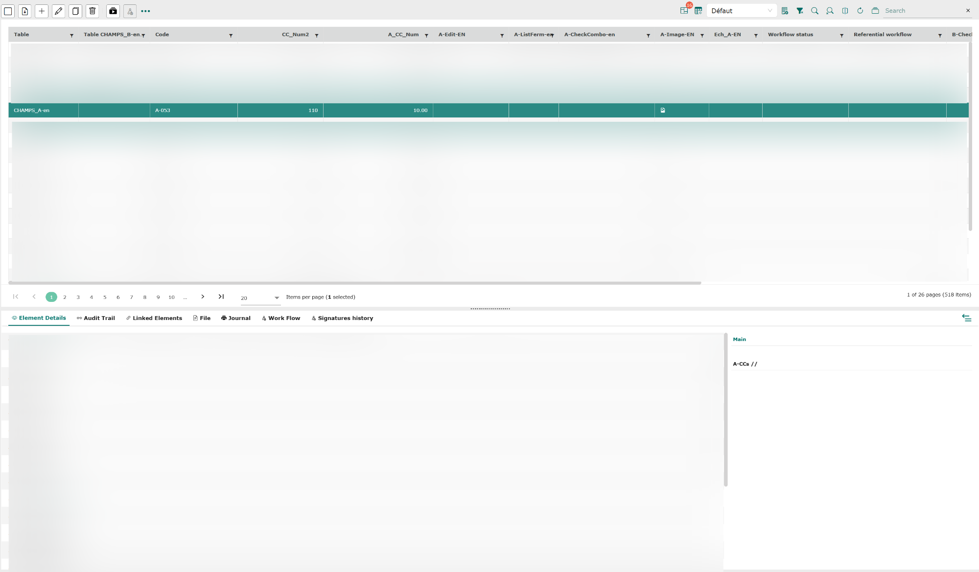 - Element details : this tab displays the contents of the element’s fields (as in a form). If one or more groups have been configured in the form, they will be displayed in the right-hand part of the grid, and it will be possible to display only the fields of the main group (default display) or of the various other groups.