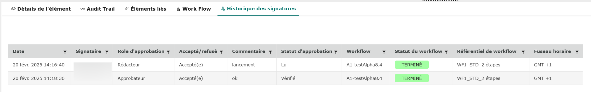 On y retrouve en plus, un horodatage (seule la date est présente dans l’onglet workflow), les commentaires renseignés, le workflow et le référentiel workflow utilisés ainsi que le fuseau horaire.