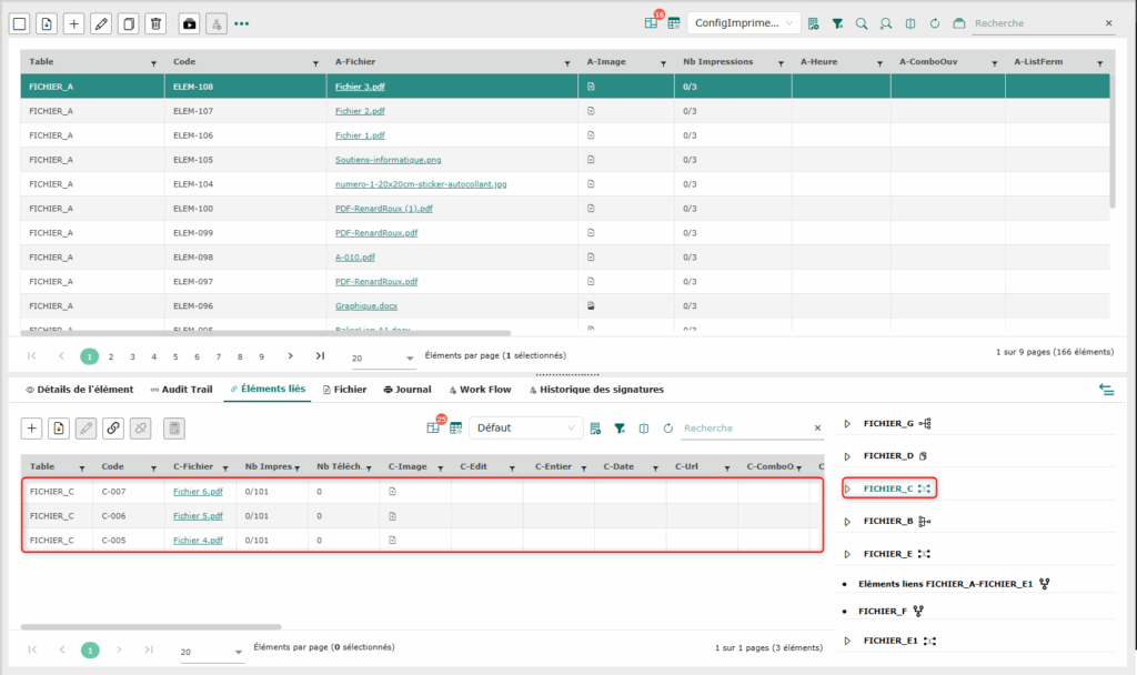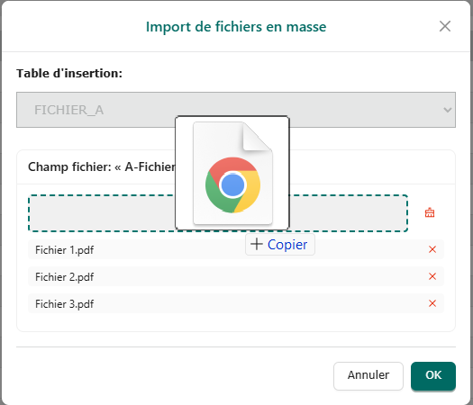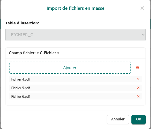 En sélectionnant une table en lien de type document (Avec un champ fichier/image), il va être possible d’importer en masse et ainsi créer et lier les documents en masse.