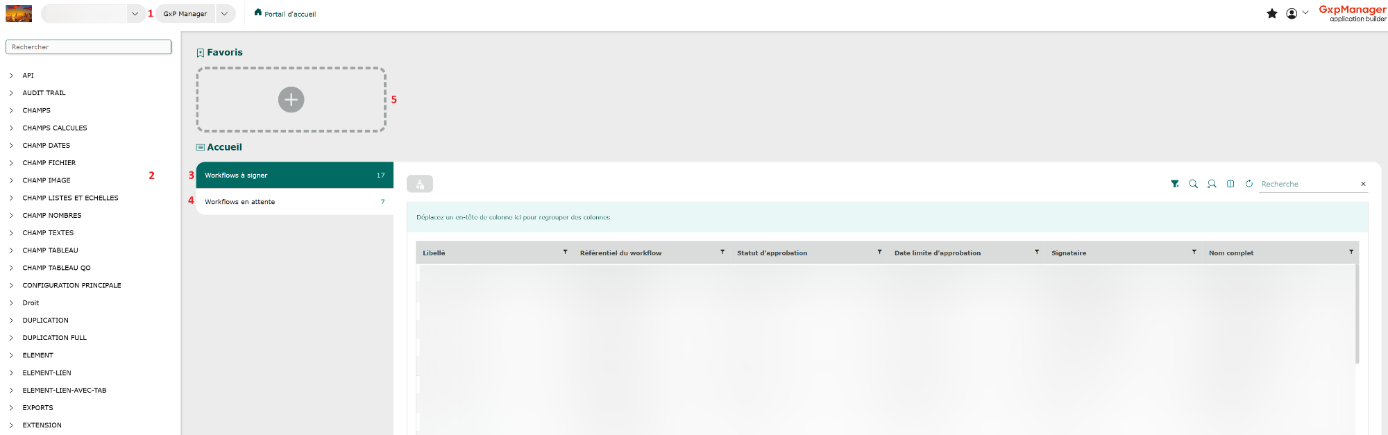 En bref : Menu utilisateur, Changement d’application, Changement de projet, Recherche dans le menu, Favoris, Workflows à signer, Workflows en attente.