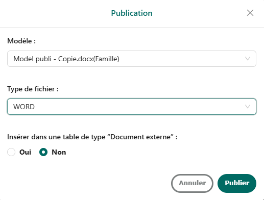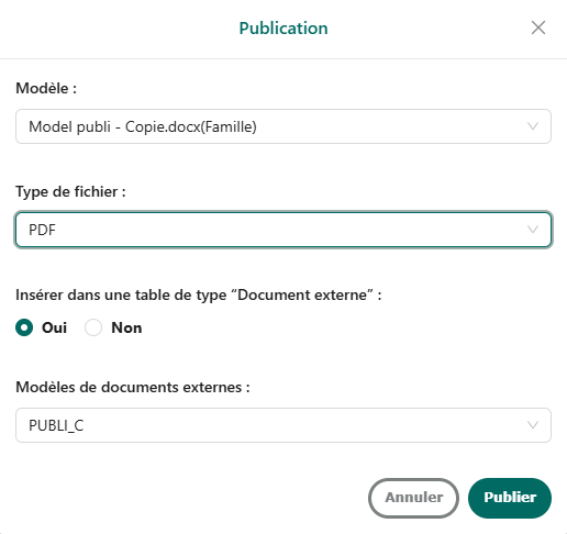 Après avoir cliqué sur publier, la fenêtre permettant de sélectionner le modèle de publication et le format du fichier (PDF ou WORD) via une liste déroulante s’ouvre.