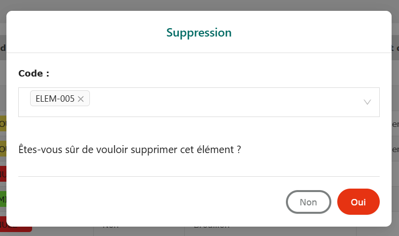Une fenêtre pop-up de confirmation de suppression de l’élément s’affiche pour confirmer ou annuler la suppression.